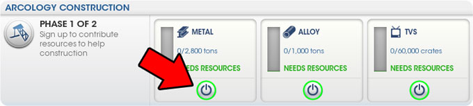 Eventually if all goes well, you should get to a point where the site becomes operational and ready to receive resources. In order to 'sign up' and start contributing resources you need to click the on/off buttons below each resource type so that they are green. Once you do this then any of those materials in your city which are set to 'use locally' in a trade depot, will be shipped (slowly) to the Great Works site.